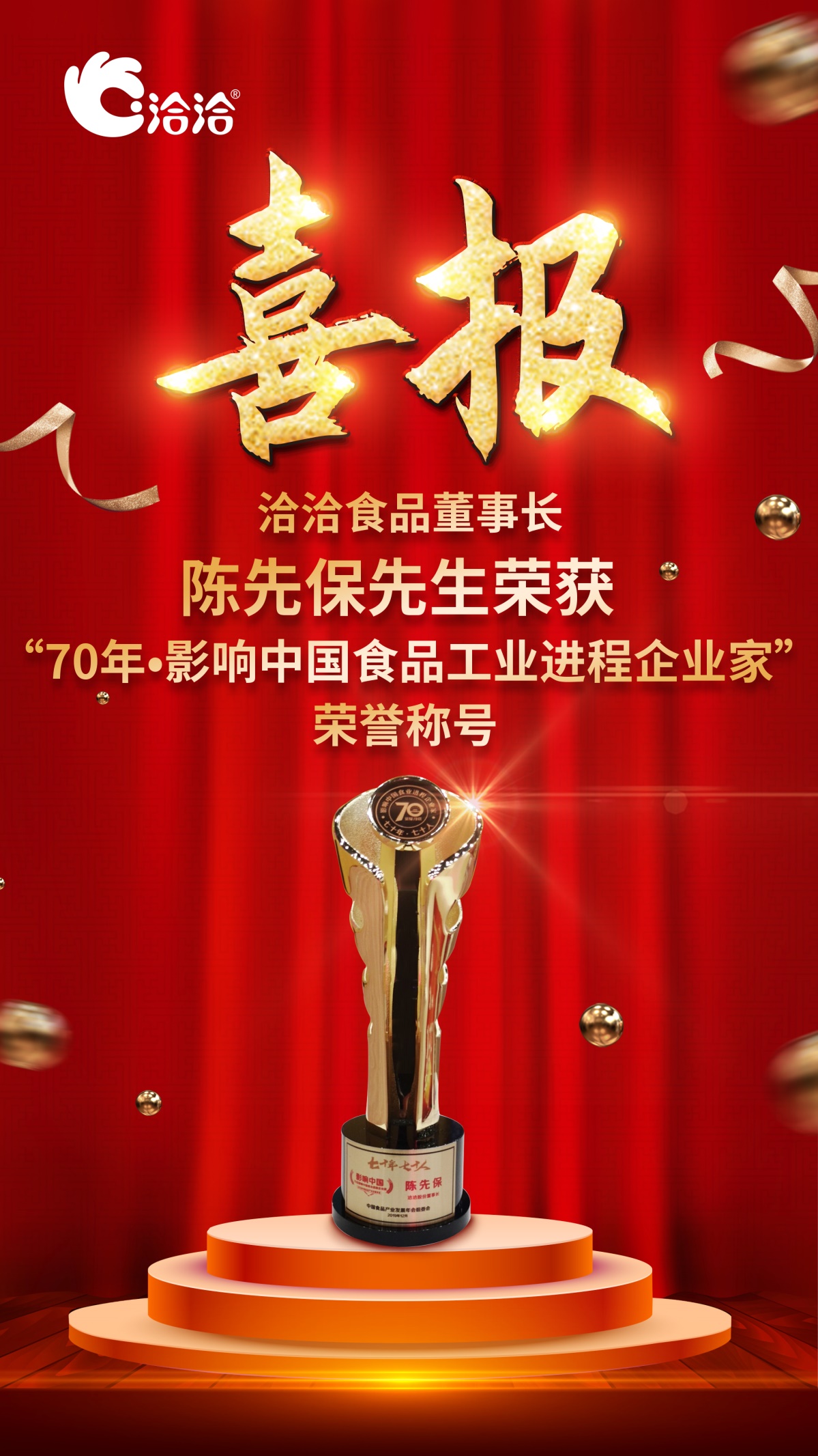 12月6日,“榮耀七十年·走進新時代——2019中國食品產(chǎn)業(yè)發(fā)展年會暨2019(第四屆)華糖萬商領(lǐng)袖大會”在鄭州隆重召開。70年?食業(yè)改變中國,為表彰致敬70年來為中國食品工業(yè)做出杰出貢獻的企業(yè)家,大會開展了“70年?70人——全民推選影響中國食品工業(yè)進程企業(yè)家”評選活動,眾多全國食品工業(yè)領(lǐng)域的杰出企業(yè)家成為推選人物。最終通過全民票選,洽洽董事長陳先保先生獲頒“70年?影響中國食品工業(yè)進程企業(yè)家”榮譽稱號。 榮耀70年,走進新時代!奮戰(zhàn)20年,展望未來,